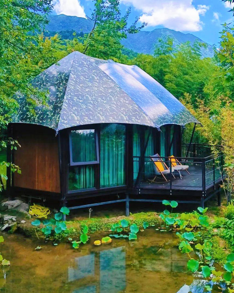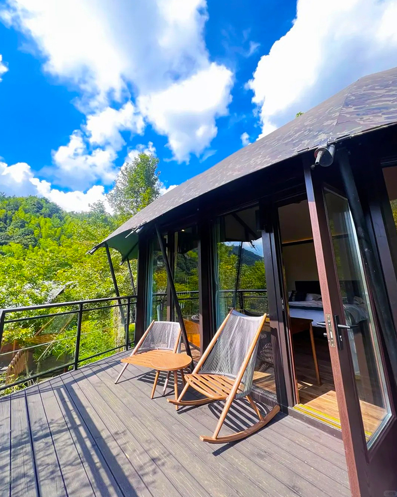 營地周邊植被茂密,景色(sè)壯美,青山綠水環繞,藍(lán)天白雲相映,負氧離子爆表。營地內,30棟高端拚裝式木屋(wū)民宿(xiǔ)錯落有致,周末待在這裏看日出日落,躺在陽台(tái)的搖椅上,聽蟲鳴蟬叫~