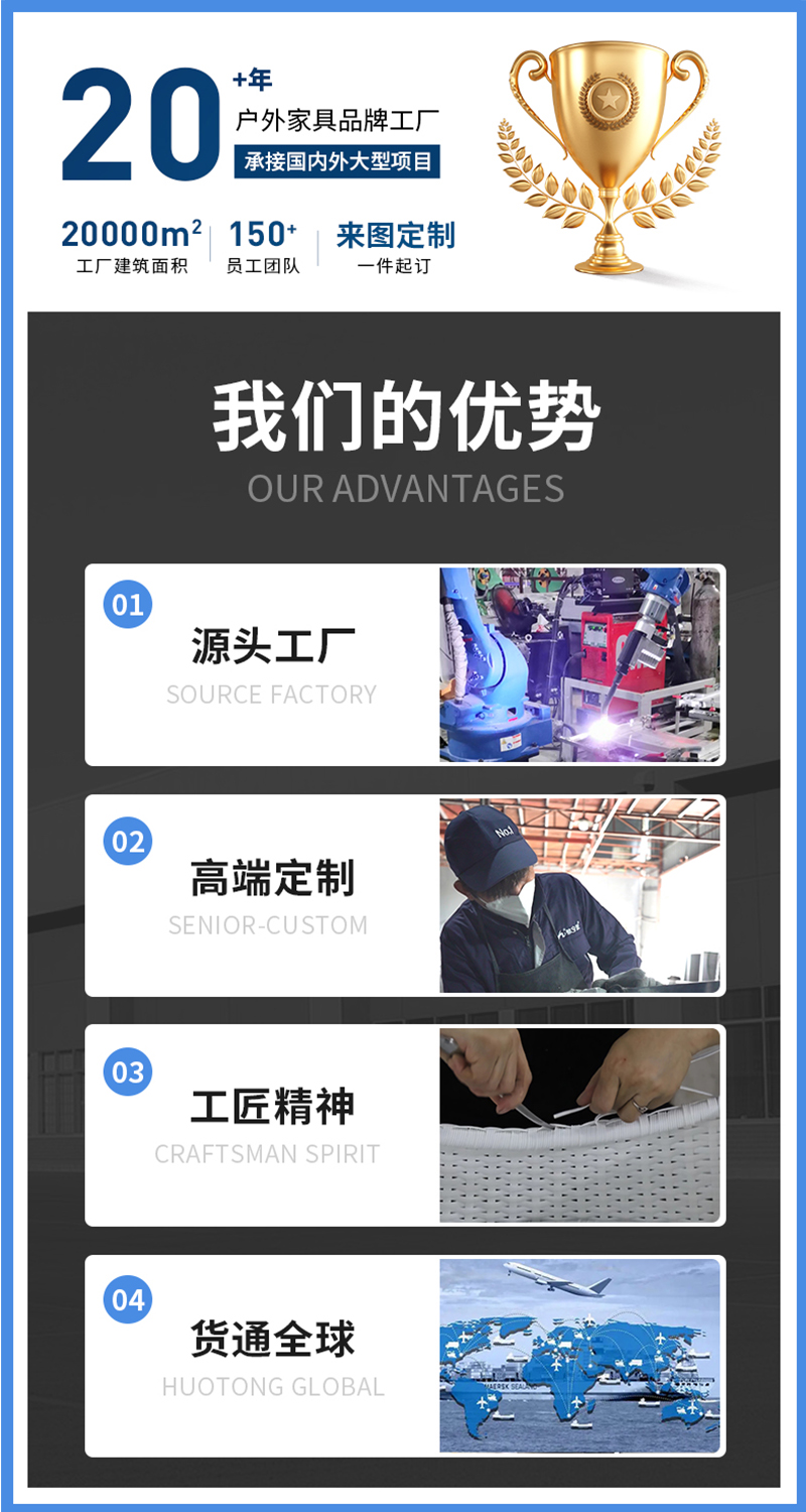 17.C1起草视频休(xiū)閑家(jiā)具致力於休閑生(shēng)活全方位的(de)解決方案(àn)。產品涵蓋了休閑家具、戶外遮陽、庭院休(xiū)閑配套三大係列近千個品種。形成了集花園休閑理念設計、生產、製(zhì)造、銷售(shòu)、服務為一體的專業企業。
